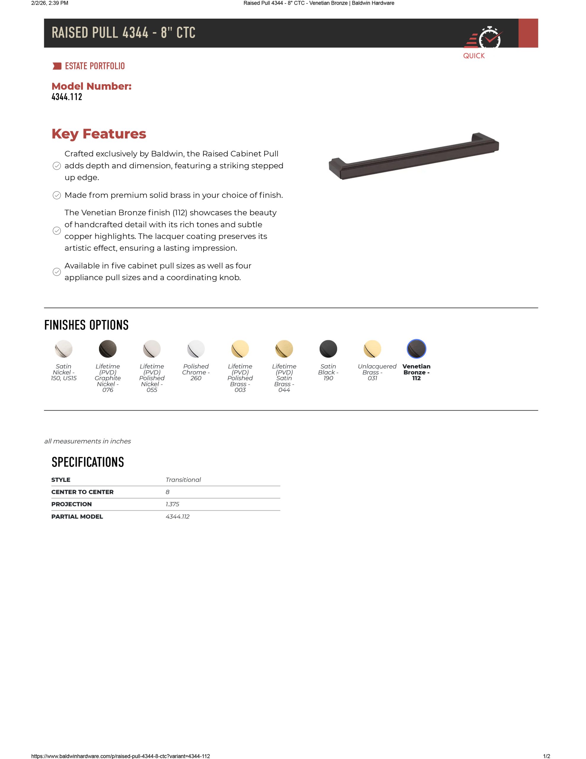 Satin Nickel – 150, US15, Lifetime (PVD) Graphite Nickel – 076, Lifetime (PVD) Polished Nickel – 055, Polished Chrome – 260, Lifetime (PVD) Polished Brass – 003, Lifetime (PVD) Satin Brass – 044, Satin Black – 190, Unlacquered Brass – 031, Venetian Bronze – 112