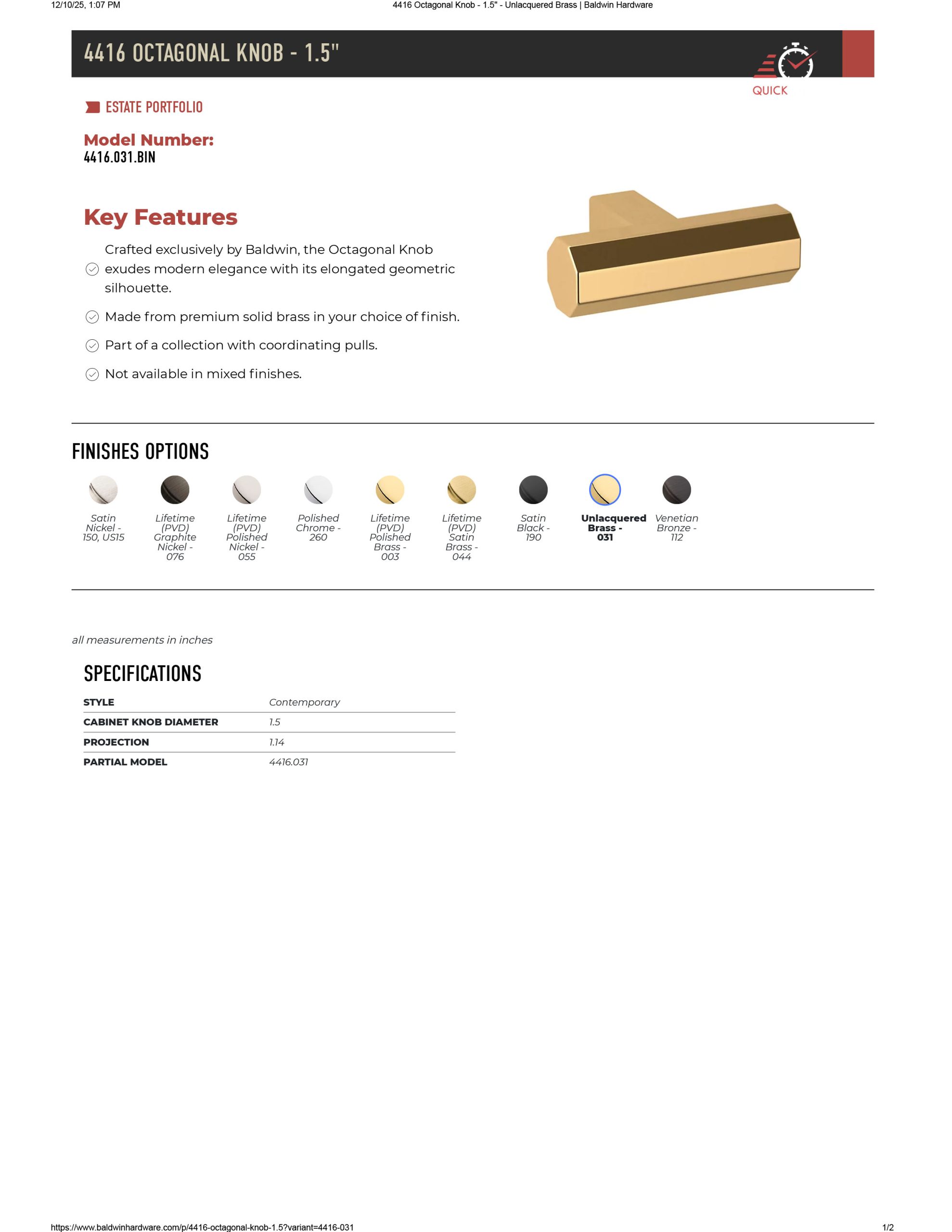Baldwin 4416 Octagonal Knob 1.5″ Cabinet Knob