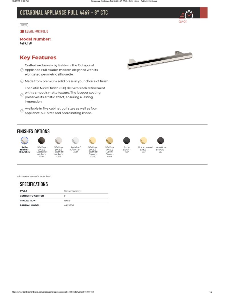 Baldwin 4469 Octagonal Appliance Pull 8″ CTC Cabinet Pull