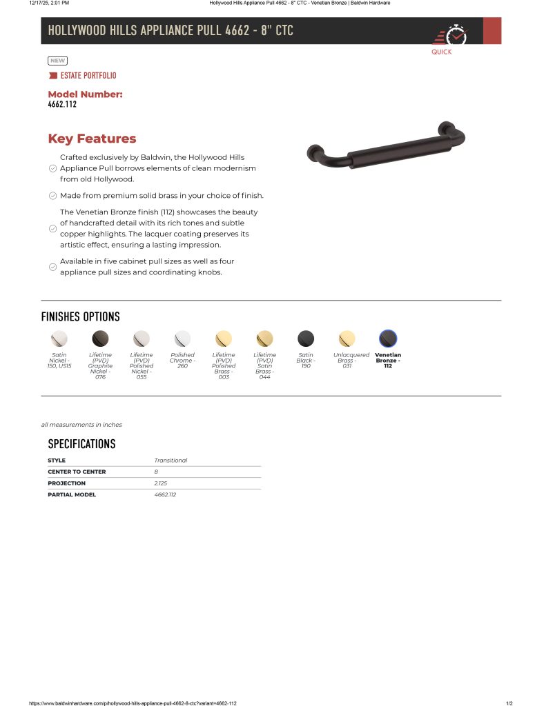 Baldwin 4662 Hollywood Hills Appliance Pull 8″ CTC Cabinet Pull
