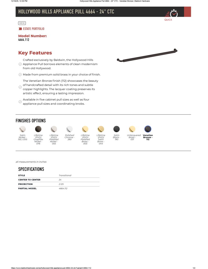 Baldwin 4664 Hollywood Hills Appliance Pull 24″ CTC Cabinet Pull