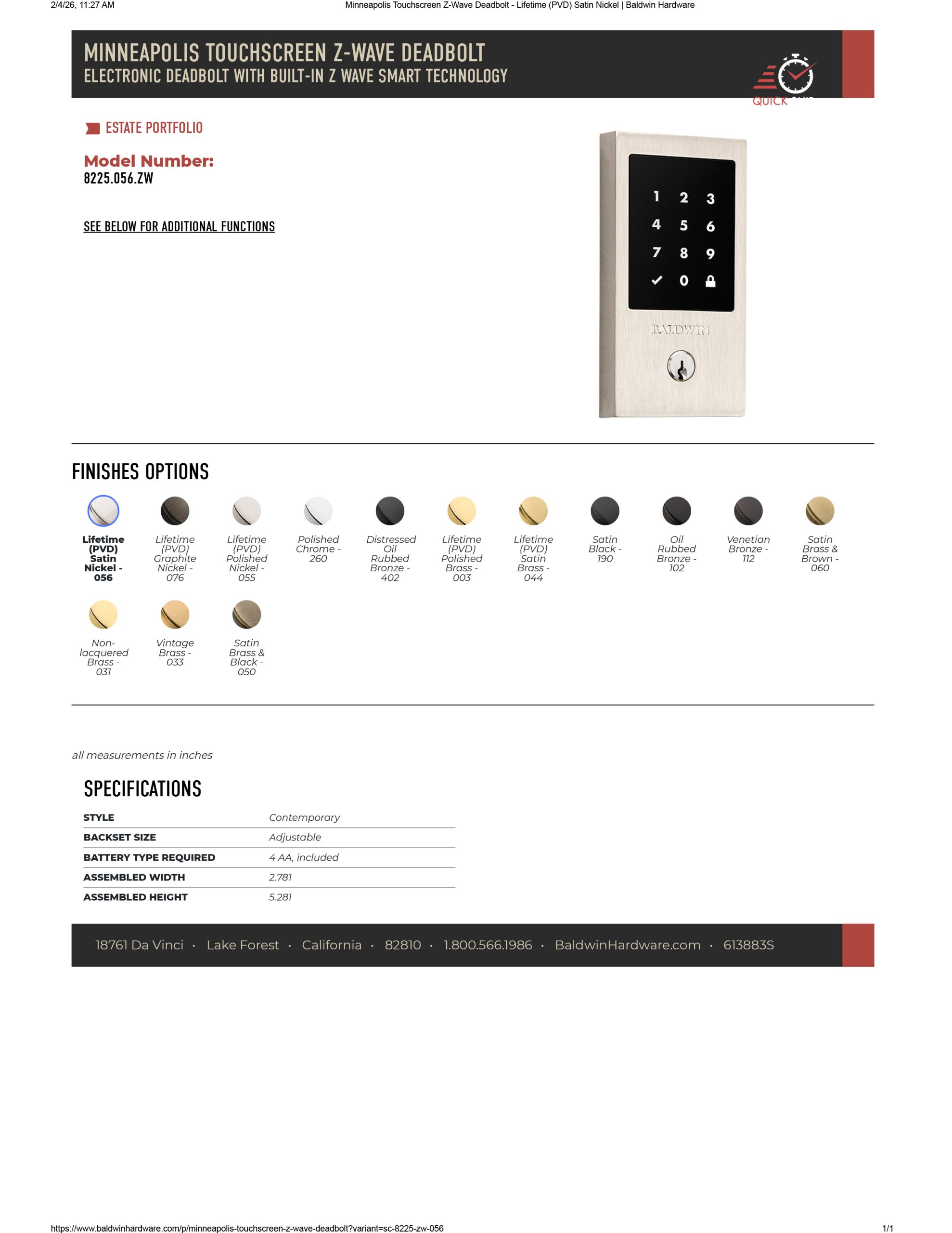 Baldwin 8225 Minneapolis Touchscreen Z-Wave Smart Electronic Deadbolt