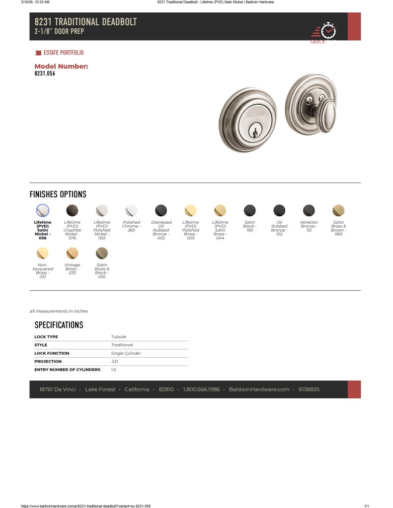 - Available Functions: Single Cylinder (most popular – deadbolt has key on outside/turn knob on inside), Double Cylinder (deadbolt has key outside and inside).