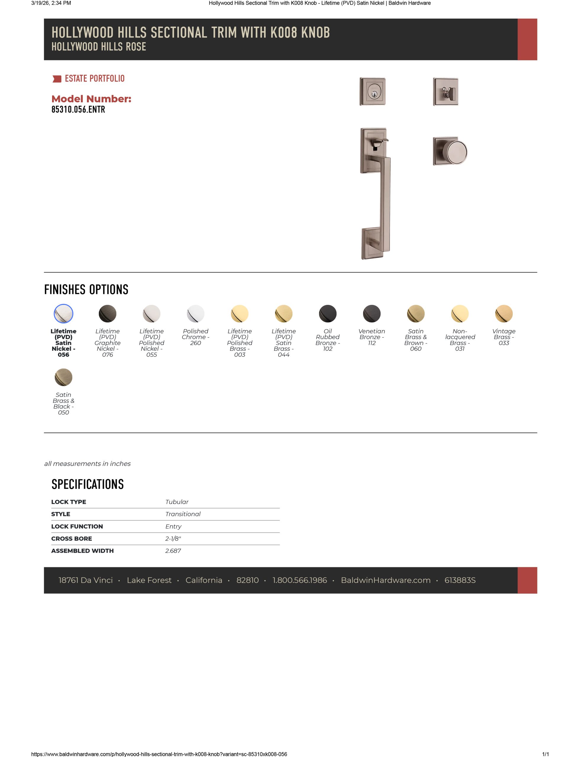 Baldwin Estate 85310 Hollywood Hills Sectional Full Dummy Set with K008 Interior Knob
