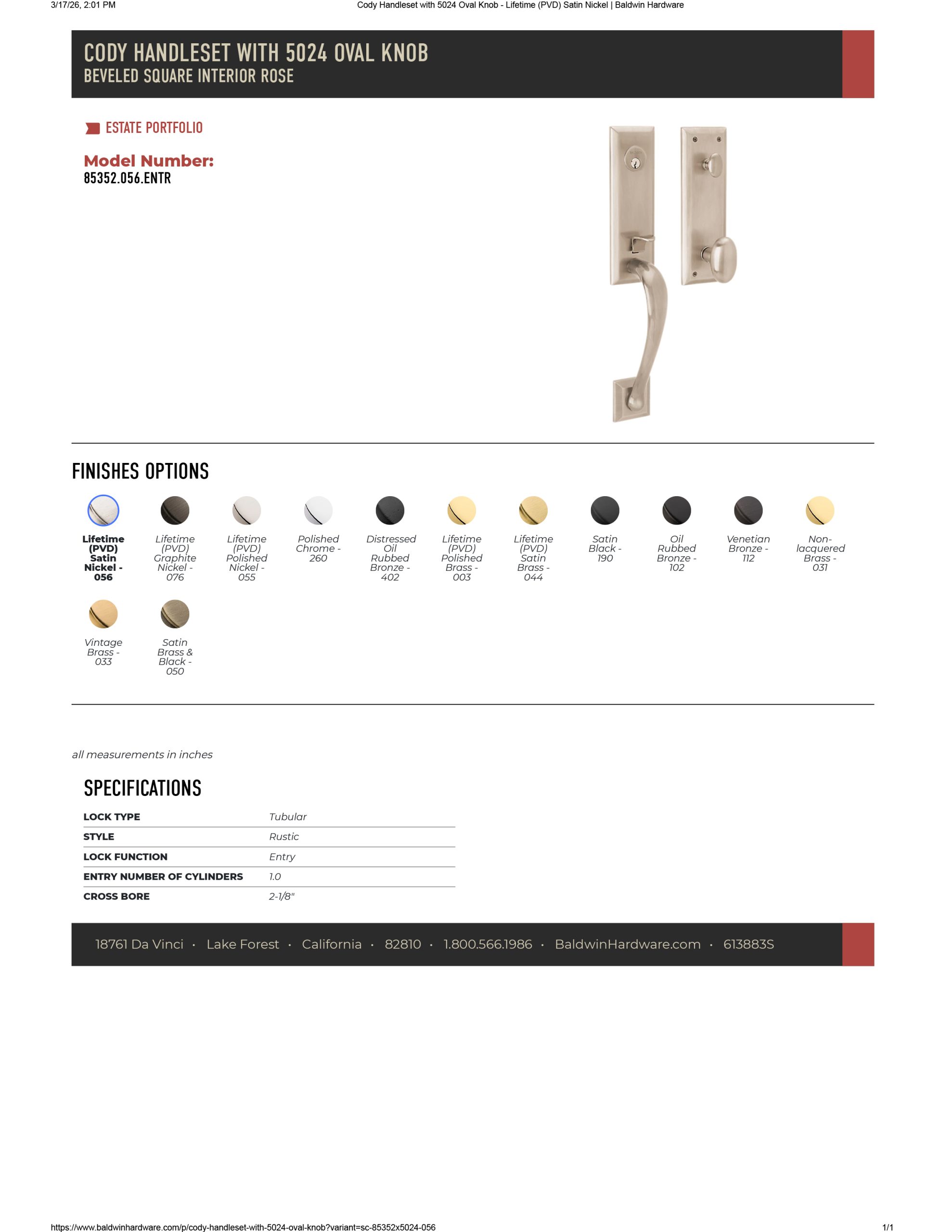 Baldwin Estate 85352 Cody 3/4 Escutcheon Emergency Egress Handleset with 5024 Interior Knob