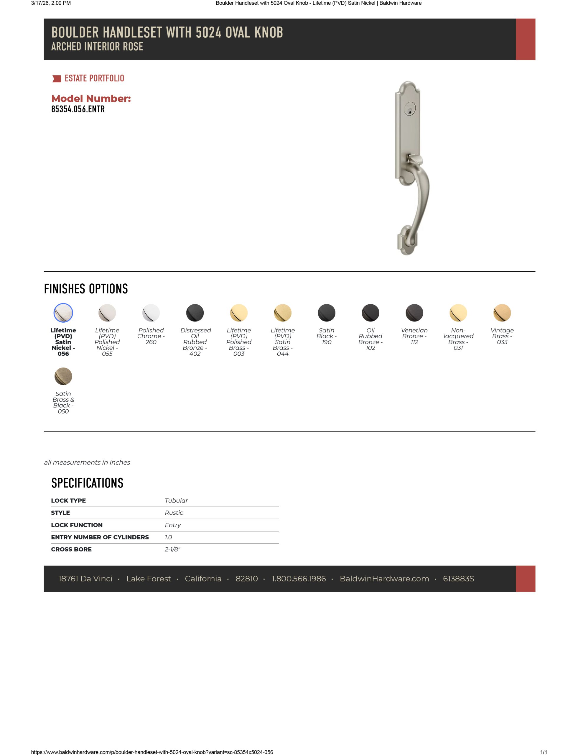 Baldwin Estate 85354 Boulder 3/4 Escutcheon Emergency Egress Handleset with 5024 Interior knob