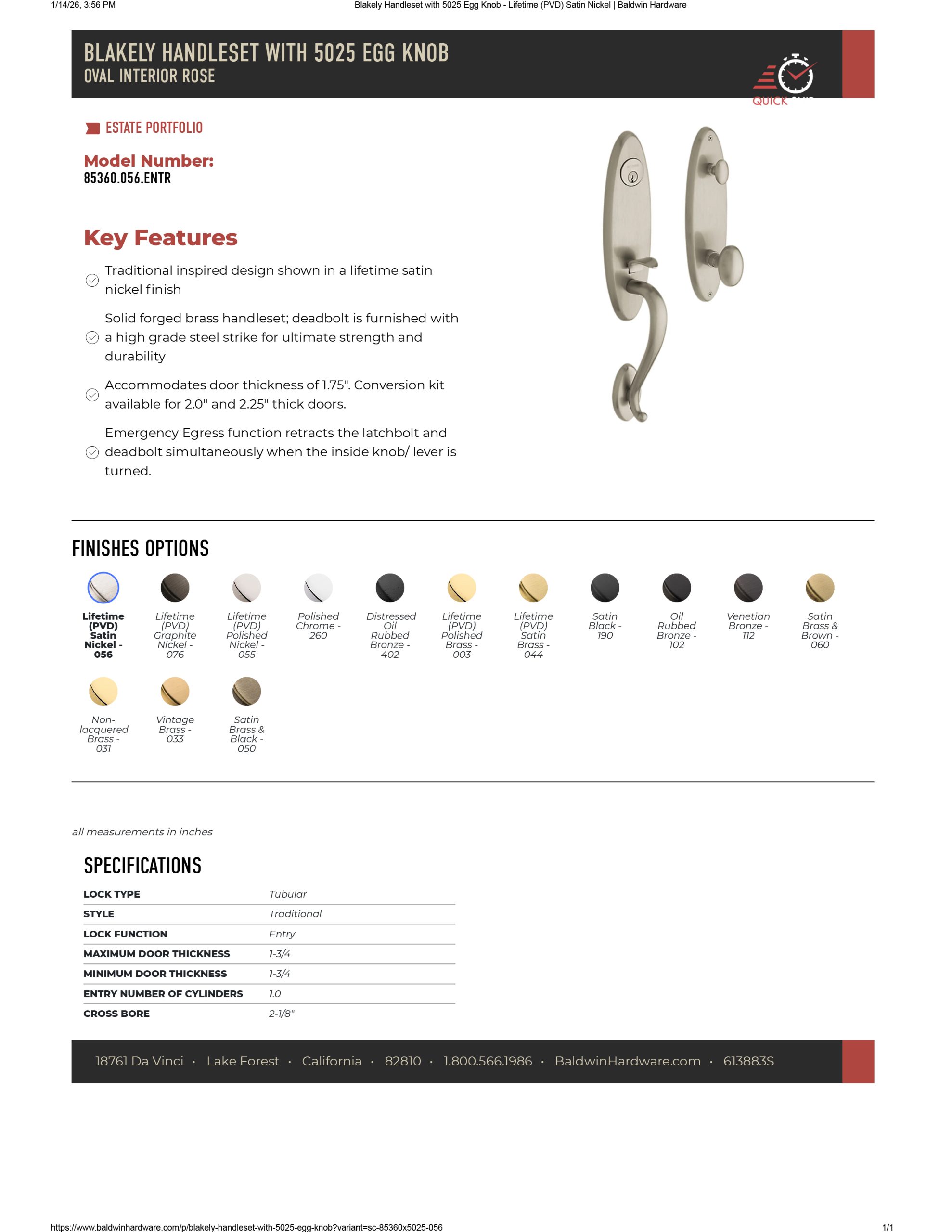 - Traditional inspired design shown in a lifetime satin nickel finish