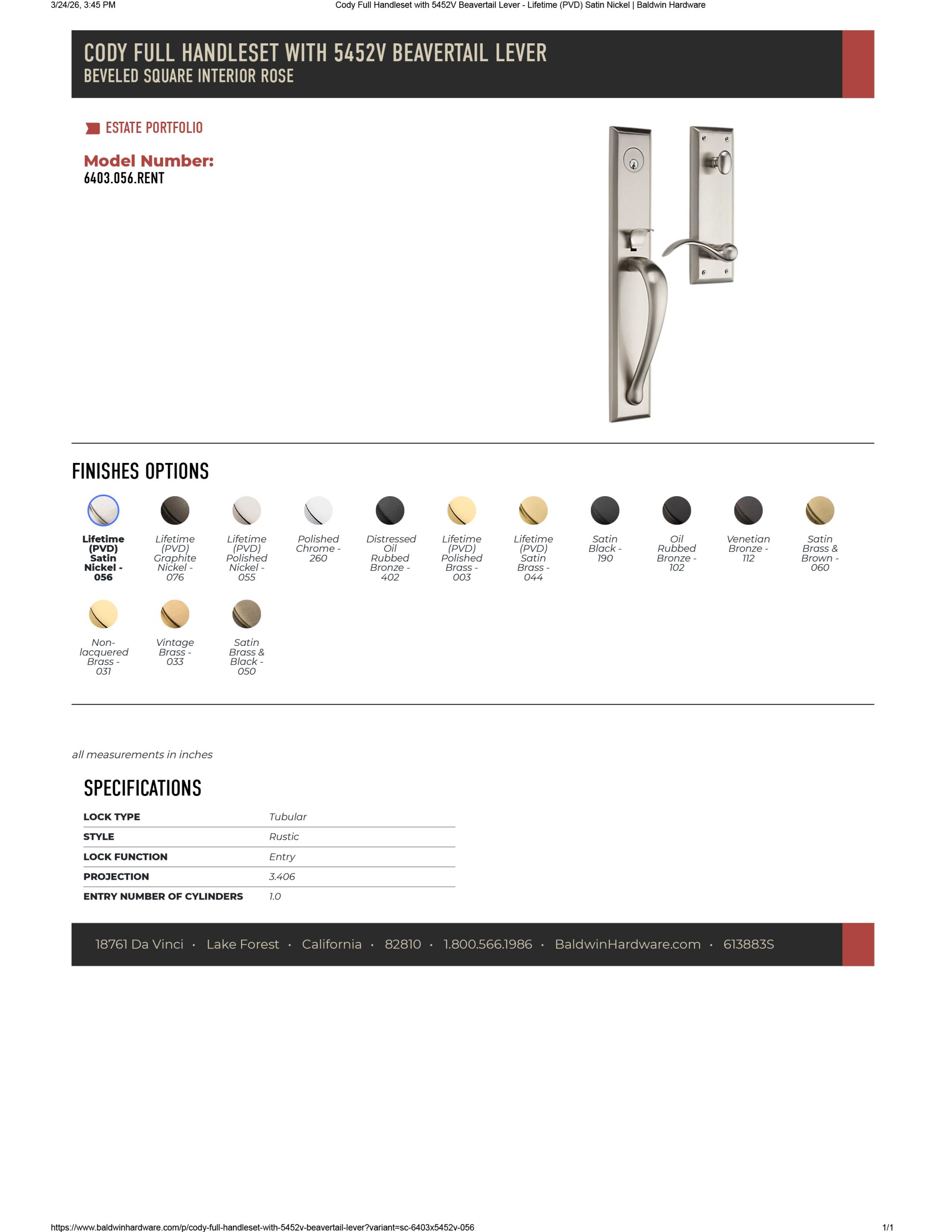 Baldwin Estate 6403 Cody Full Escutcheon Emergency Egress with 5452V Interior Lever