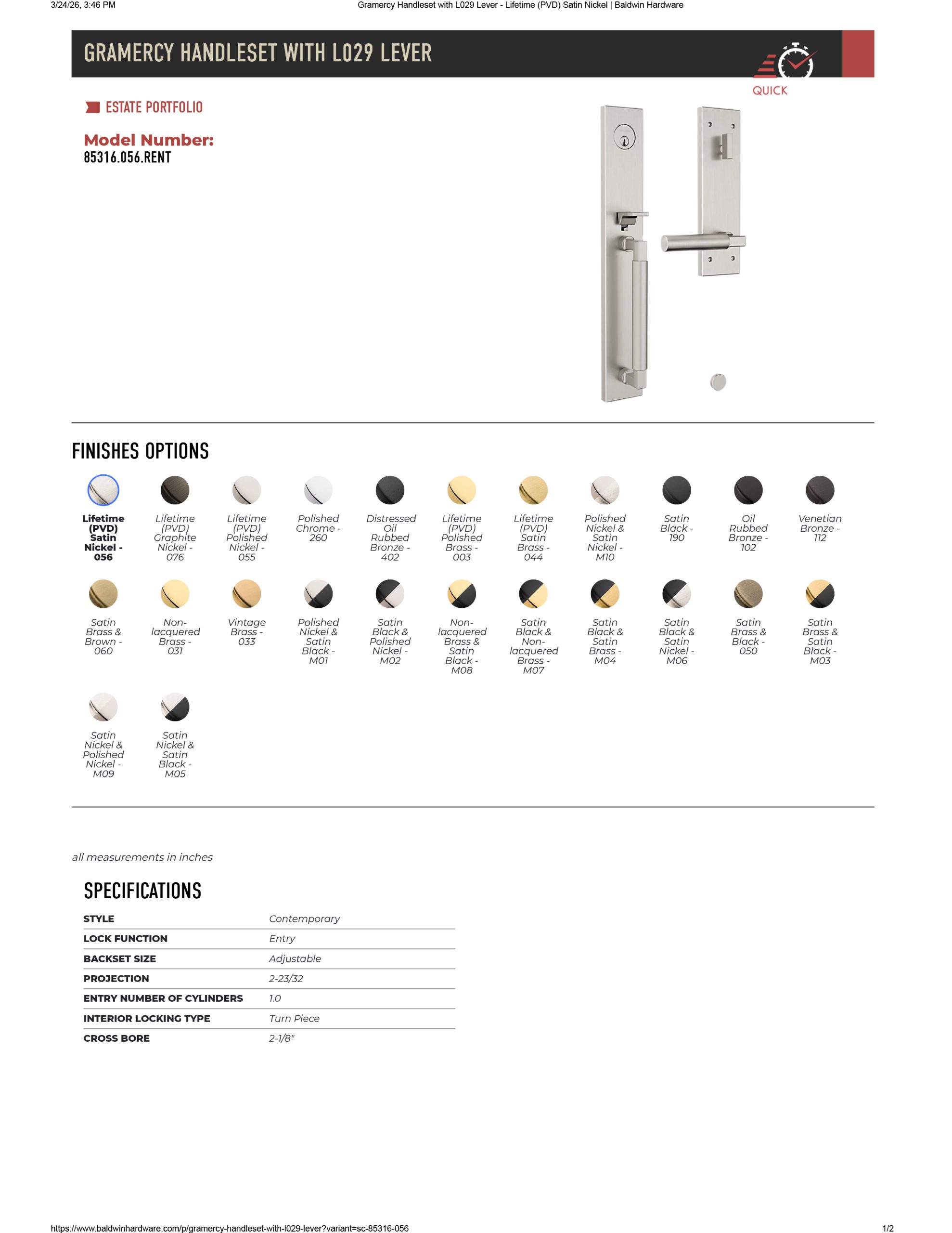 Baldwin Estate 85316 Gramercy Full Escutcheon Emergency Egress with L029 Interior Lever