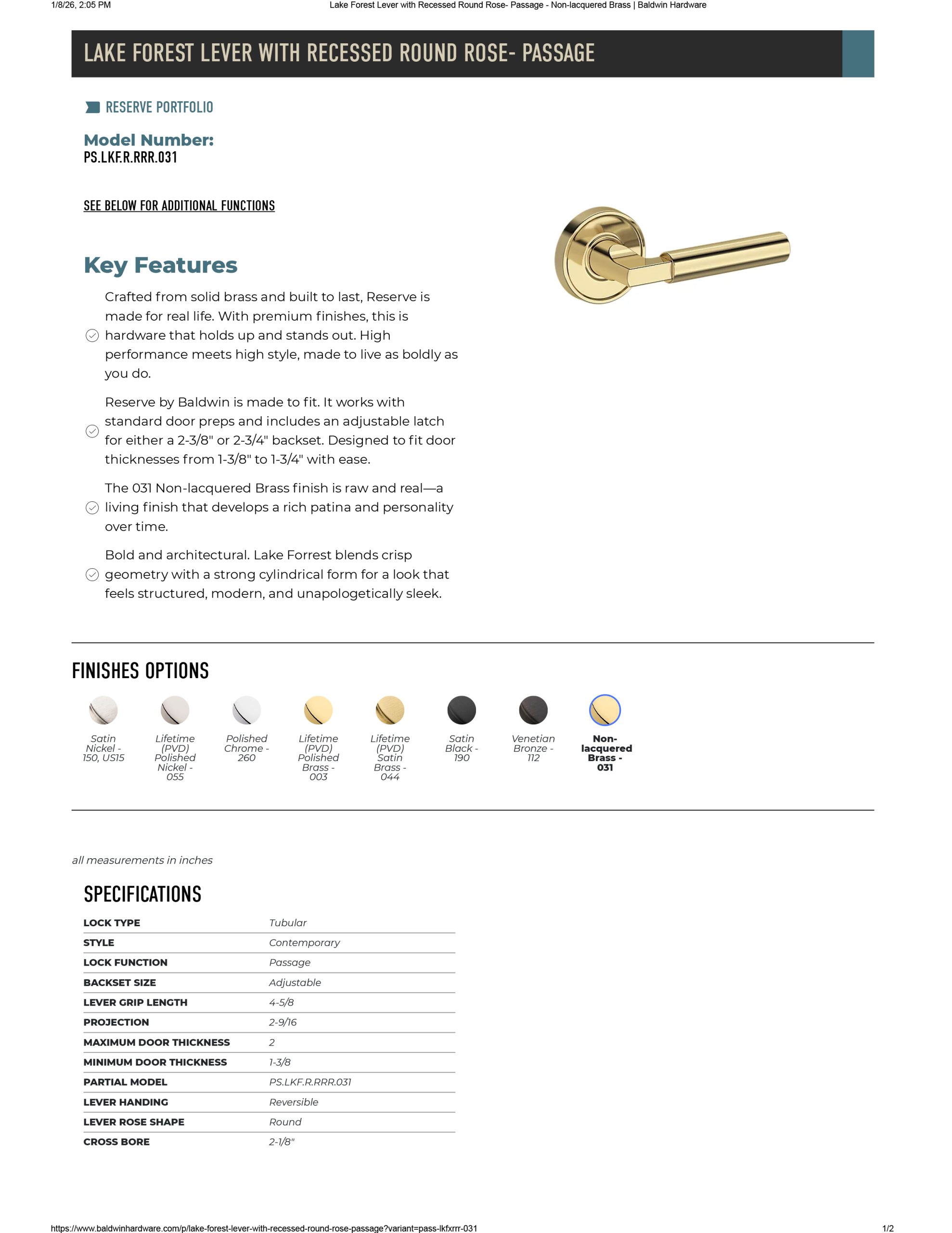 Baldwin Lake Forest Lever Recessed Round Rose – RESERVE PORTFOLIO