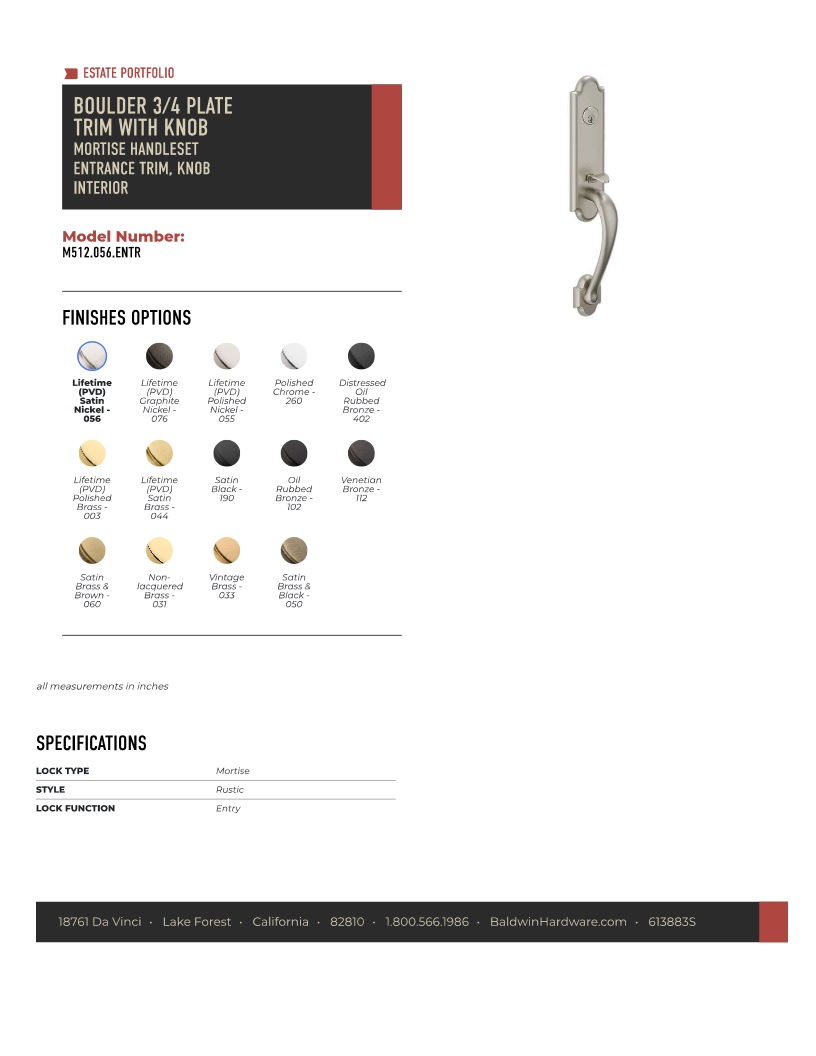 Baldwin Estate M512 Boulder Mortise Handleset with 5452V Interior Lever