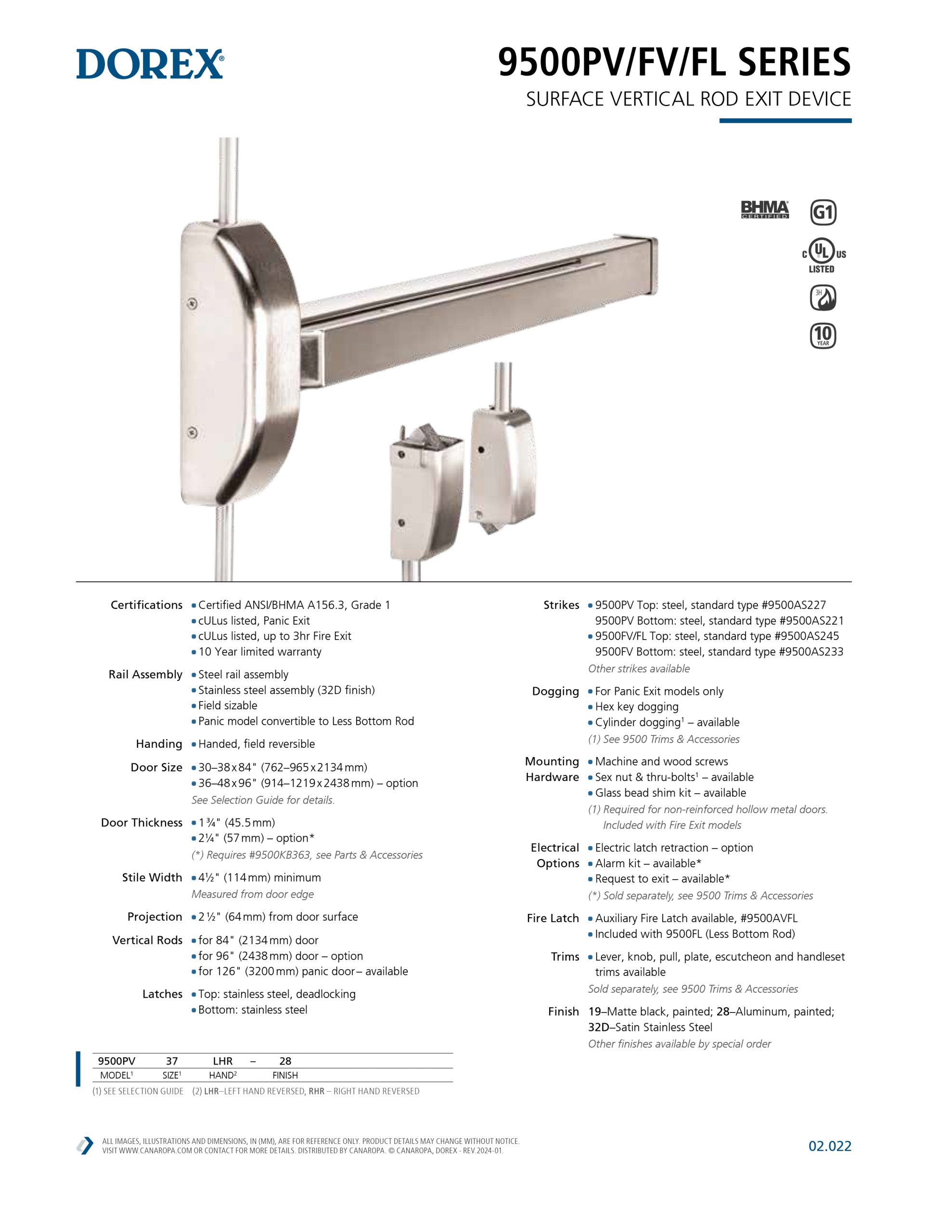 Dorex 9500FV Fire surface vertical rod exit device (3Hr)