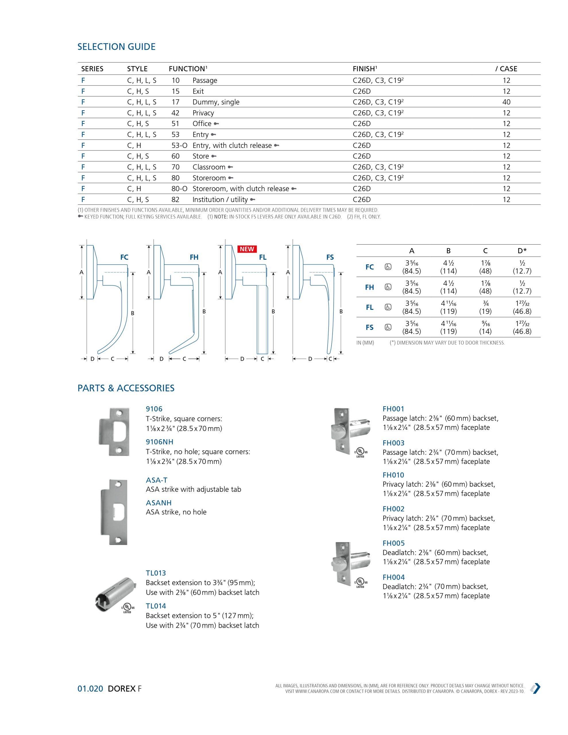 FH001 Passage latch: (60 mm) backset, FH003 Passage latch: (70 mm) backset, FH010 Privacy latch: (60 mm) backset, FH002 Privacy latch: (70 mm) backset, FH005 Deadlatch: (60 mm) backset, FH004 Deadlatch: (70 mm) backset