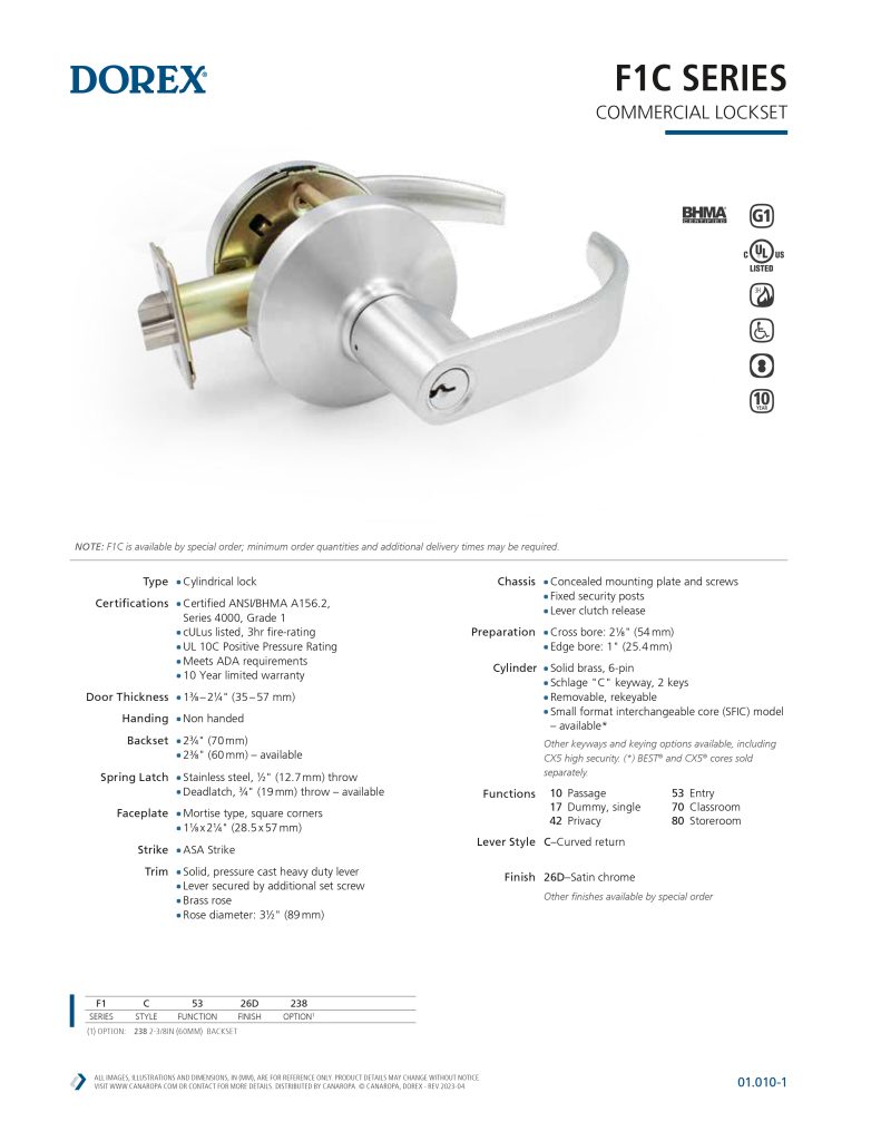 Dummy, Not Required, Supplied 2 3/4" Backset, F1001: Passage latch: 23⁄8" (60 mm) backset,, F1010: Privacy latch: 23⁄8" (60 mm) backset,, F1005: Deadlatch: 23⁄8" (60 mm) backset, F1DL234-34: Deadlatch: 23⁄4" (70 mm) backset, 3⁄4" (19 mm)