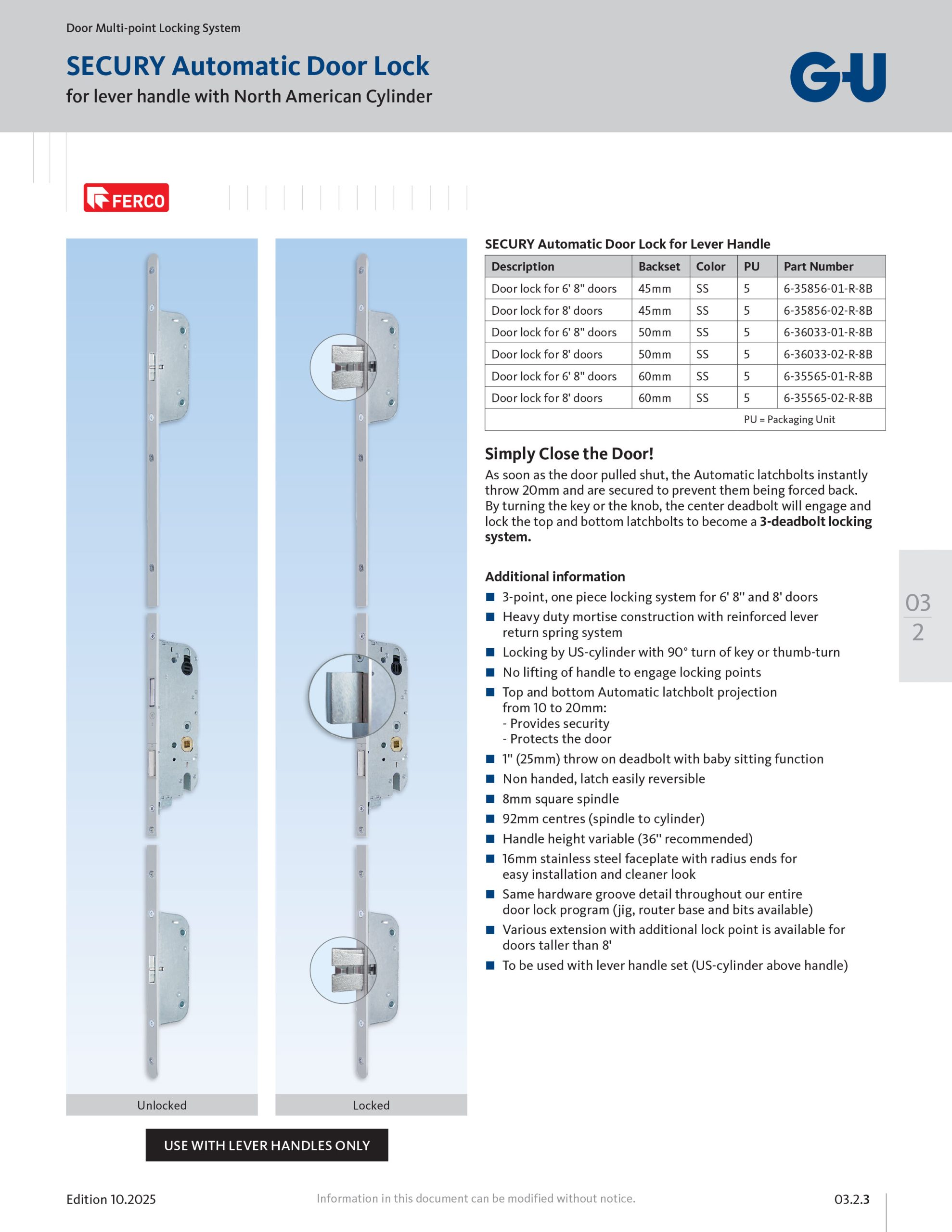 - 3-point, one piece locking system for 6′ 8” and 8′ doors