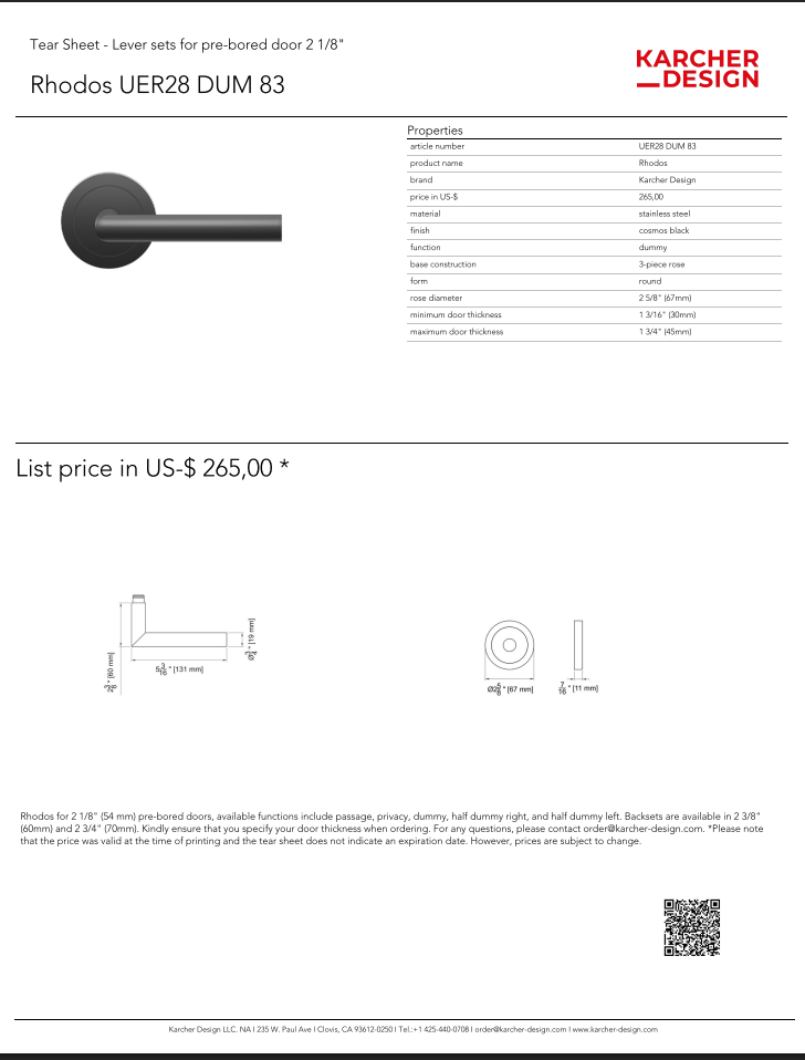 Half Dummy Left, Half Dummy Right, Full Dummy Set, Passage 2 3/8" (60mm), Passage 2 3/4" (70mm), Privacy 2 3/8" (60mm), Privacy 2 3/4" (70mm)