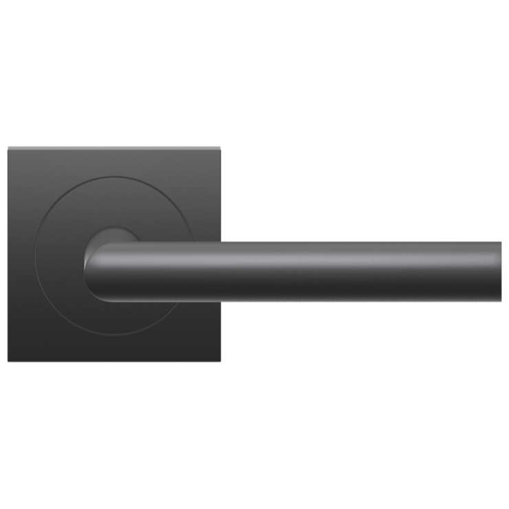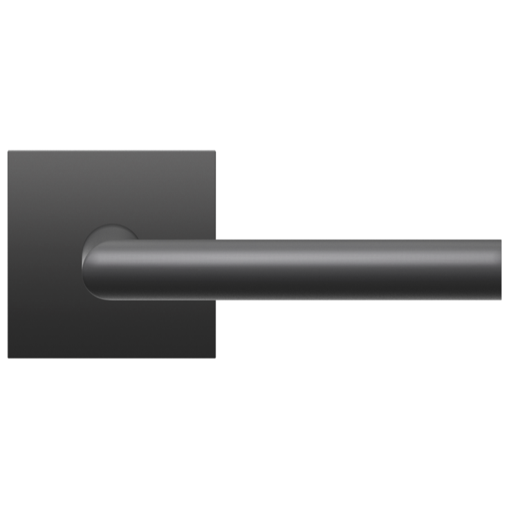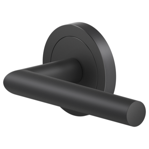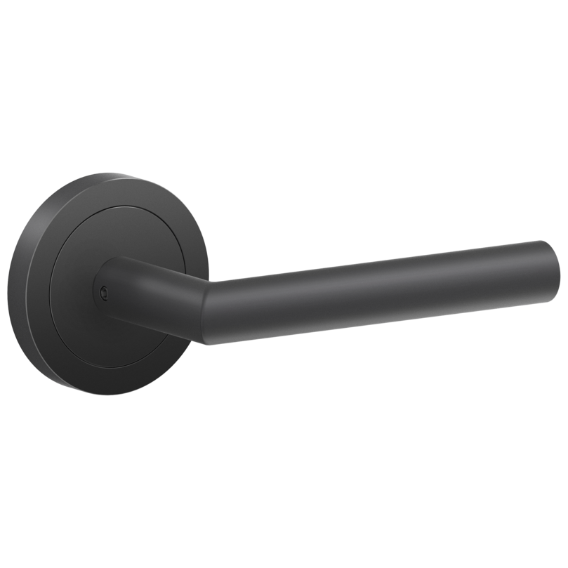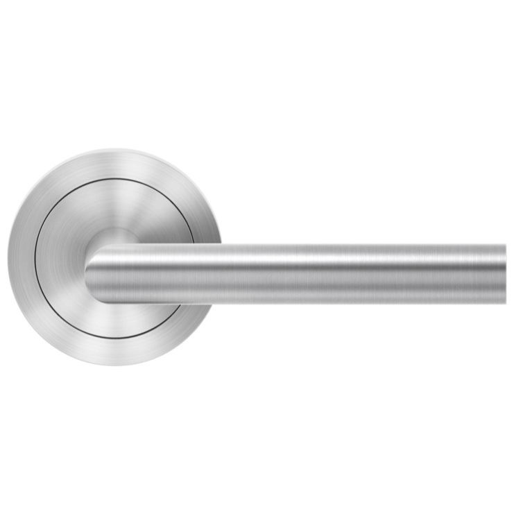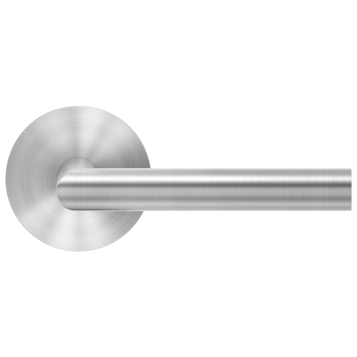 Stainless steel lever handle “Rhodos” on 2 5/8” rose: latch set for pre-bored doors.